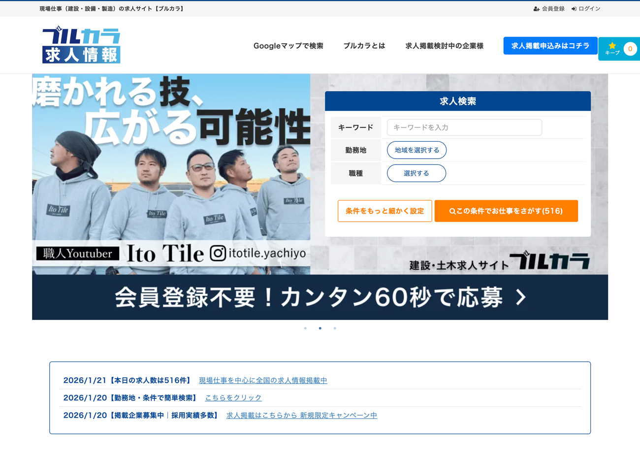 現場求人が登録不要で簡単に探せる!建設業求人サイトは【ブルカラ】